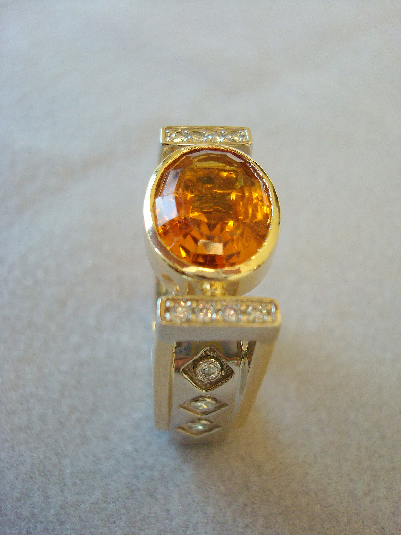 The Yanovich ring features an oval citrine that was very dear to the customer and is made in 18 karat yellow and white gold with strong and bulky contemporary lines.