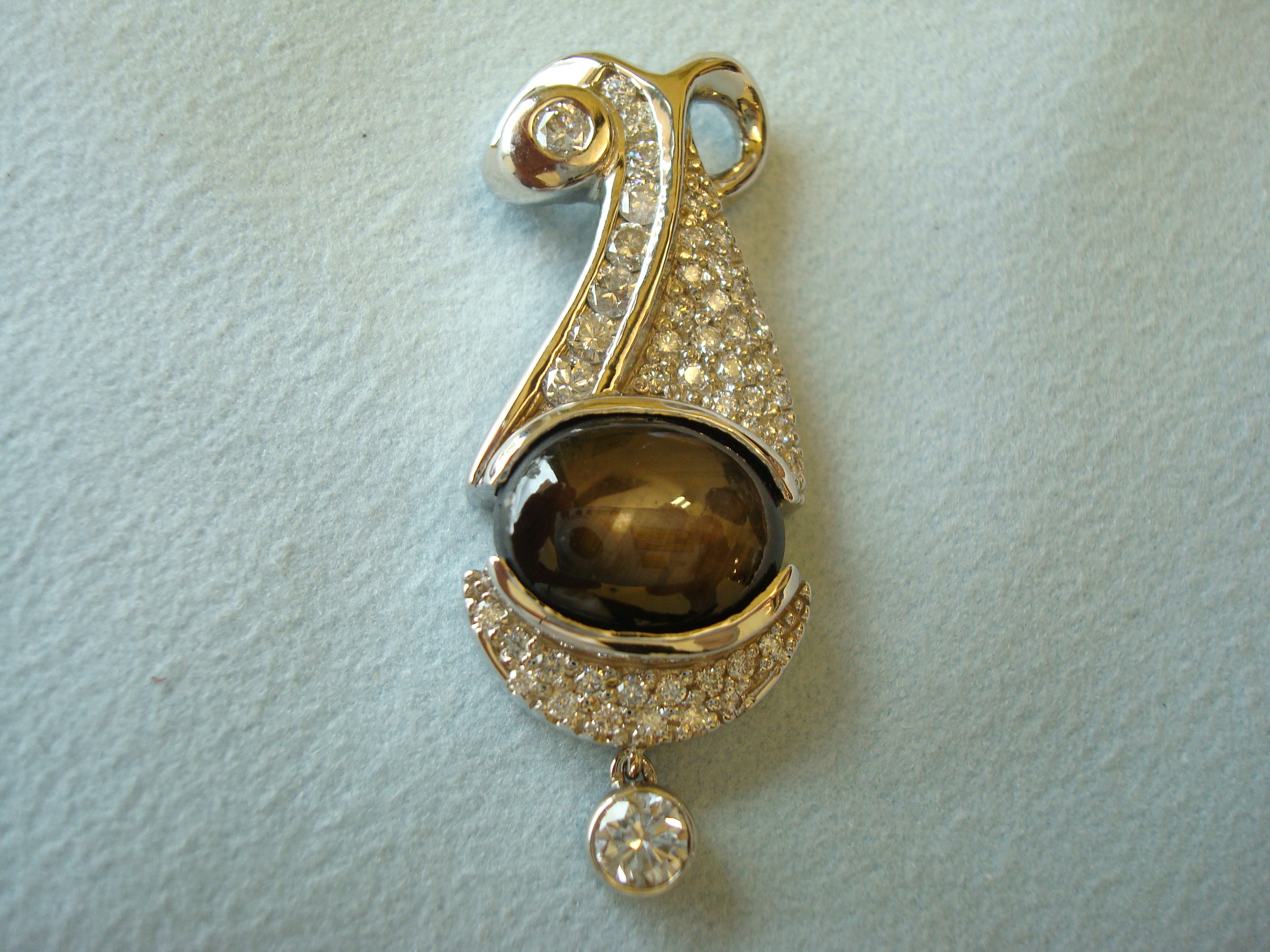 The Safra pendant features an oval cabushon black star shaphire that belong to our customer's grandfather. Is made in 14 karat white gold with pavé, channel set and bezel set round brilliant cut diamonds.